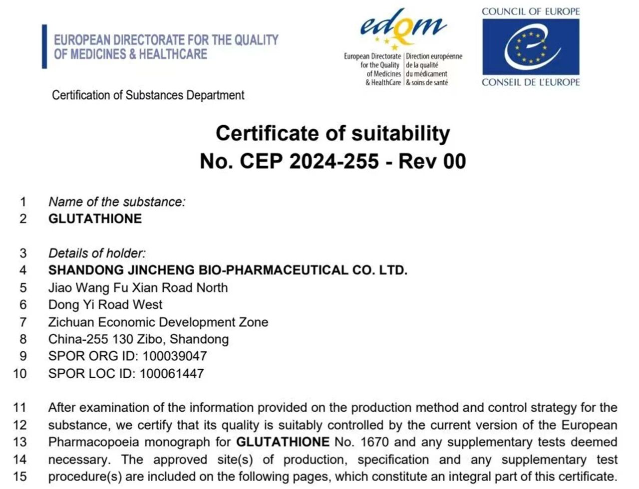 近日,金城医药集团全资子公司山东金城生物药业有限公司收到欧洲药品质量管理局(EDQM)签发的谷胱甘肽原料药欧洲药典适用性证书(简称“CEP证书”),标志着公司谷胱甘肽产品获得欧洲官方的认可。